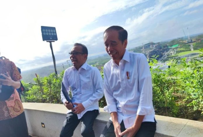 Ditemani Menteri Sekretaris Negara Pratikno, Presiden Jokowi pun lantas duduk di bagian tengah dengan pemandangan Sumbu Kebangsaan di belakangnya.