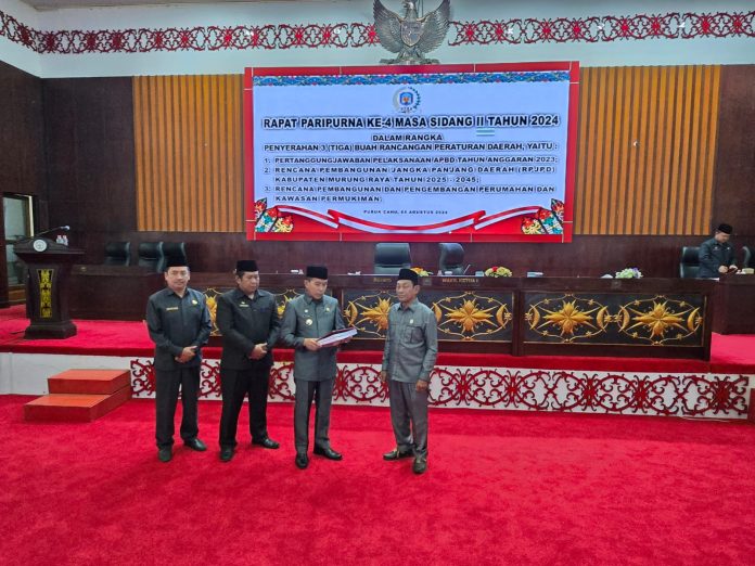Penyerahan 3 Raperda digelar dalam Rapat Paripurna Ke-4 Masa Sidang II Tahun 2024 dihadiri anggota dewan setempat, unsur forkopimda serta jajaran dari Pemkab Mura dan tamu undangan lainnya.