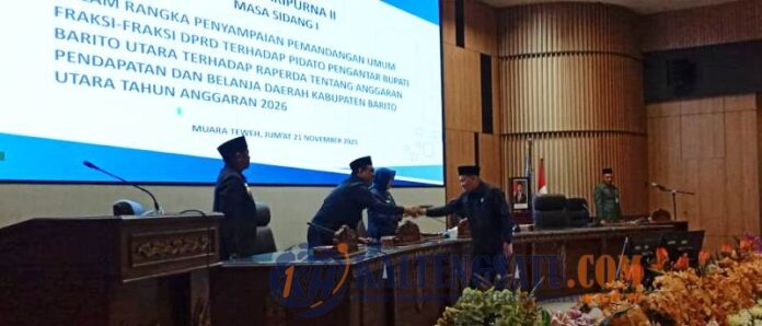 kabarmuarateweh.id – Fraksi Aspirasi Rakyat DPRD Kabupaten Barito Utara menyampaikan apresiasi tinggi kepada Bupati Barito Utara, Shalahuddin, ST., MT., atas penyampaian pidato pengantar Raperda APBD Tahun Anggaran 2026 dalam sidang paripurna. Fraksi menilai penyampaian Bupati yang terstruktur dan santun mencerminkan keteduhan kepemimpinan serta komitmen kuat dalam menjalankan arah pembangunan daerah.