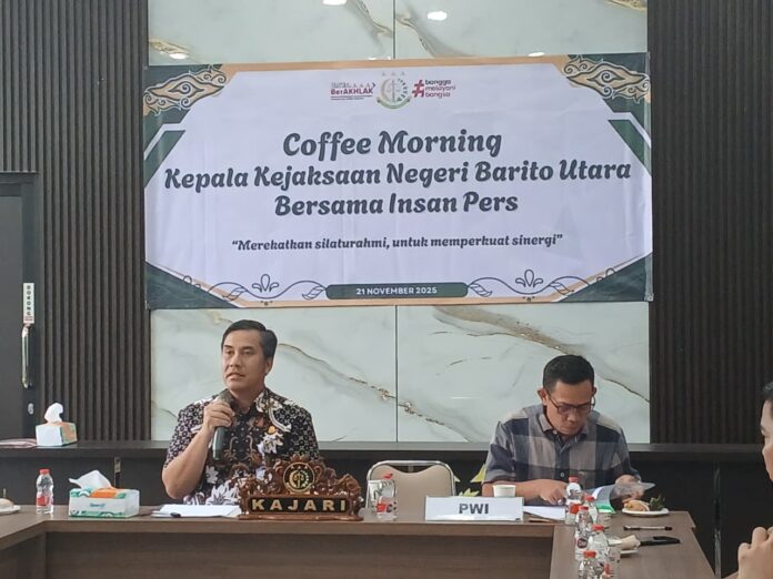 kabarmuarateweh.id – Kepala Kejaksaan Negeri (Kajari) Barito Utara, Fredy F. Simanjuntak, menyampaikan ajakan kepada Persatuan Wartawan Indonesia (PWI) Barito Utara untuk terus memperkuat kolaborasi dan membangun komunikasi yang efektif demi mendukung pelaksanaan tugas serta program Kejaksaan. Pesan tersebut disampaikannya dalam kegiatan coffee morning bersama jajaran PWI Barito Utara yang digelar di aula Kejari, Jumat (21/11/2025).