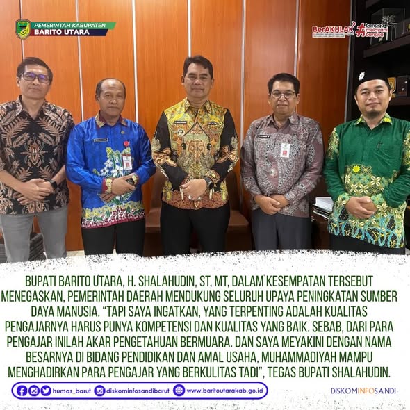 kabarmuarateweh.id -Dalam upaya mencetak sumber daya manusia yang kompeten, Bupati Barito Utara menggandeng Pimpinan Daerah (PD) Muhammadiyah Barito Utara untuk menjalin kerjasama strategis. Kolaborasi ini dilatarbelakangi pentingnya peran SDM sebagai motor utama pembangunan daerah, yang hanya dapat tercapai jika seluruh pemangku kepentingan, termasuk organisasi kemasyarakatan keagamaan, turut mendukung.
