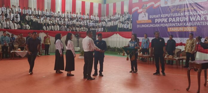 kabarmuarateweh.id, Puruk Cahu – Pemerintah Kabupaten (Pemkab) Murung Raya secara resmi mengangkat Pegawai Pemerintah dengan Perjanjian Kerja (PPPK) Paruh Waktu untuk formasi tahun berjalan. Pelantikan sekaligus penyerahan Surat Keputusan (SK) Pengangkatan dilakukan secara simbolis oleh Bupati Murung Raya, Heriyus, bertempat di GOR Tana Malai Tolung Lingu, Puruk Cahu, pada Kamis, 6 November 2025.