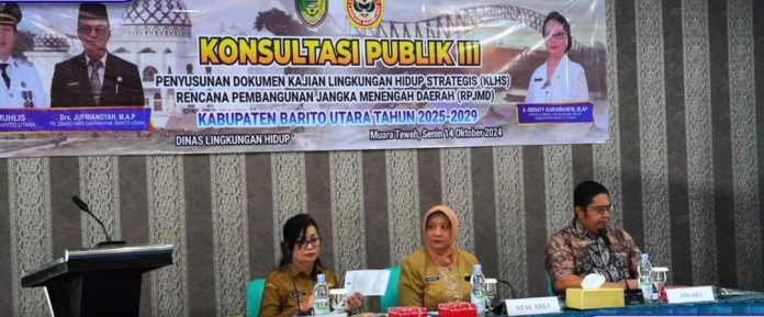 kabarmuarateweh.id, MUARA TEWEH – Pemkab Barito Utara (Barut), melalui Dinas Lingkungan Hidup setempat menggelar Konsultasi Publik Penyusunan Dokumen Kajian Lingkungan Hidup (KLHS) Rencana Pembangunan Jangka Menengah Daerah (RPJMD) Barut 2025-2029 di Aula GH Senyiur, Senin (14/10/2024).