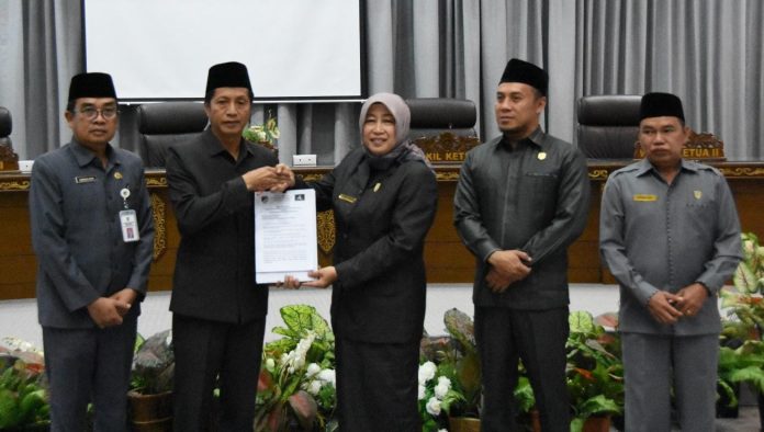 Dokumen pemandangan umum fraksi-fraksi DPRD diserahkan Ketua Dewan Hj Mery Rukaini kepada Pemkab Barut yang diterima oleh Pj Bupati Muhlis. Foto: dok. Diskominfosandi Barut